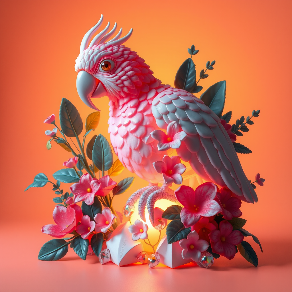 A fantastical 3D sculpture of a parrot emerges, its form abstract yet distinct. Its plumage seamlessly entwines with vibrant foliage and delicate flowers, casting an ethereal glow. The bird and flora seem to emit a gentle, luminescent aura against a warm, sunset-orange backdrop. Subtle hints of iridescent shimmer dance across its surface, adding layers of mystery and wonder.
