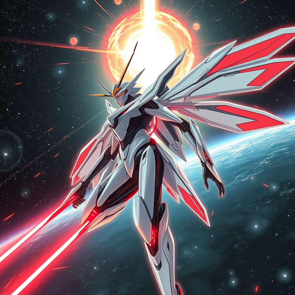 Portrait of a streamlined sci-fi mech with a slender figure in a dynamic combat pose, featuring glossy white and red detailing, evoking an insectoid sci-fi aesthetic. The mech is equipped with intricate sci-fi wings, styled similar to the works of Tsutomu Nihei and Akira, set against the breathtaking backdrop of a luminous quasar and the vast cosmos. The scene is enriched with dramatic backgrounds, showcasing a cascade of stars and quasars. The setting is alive with powerful plasma beams and a radiant plasma blast wave, highlighting an 8k UHD graphics quality. The artwork is rendered in anime style, with hyper-realistic elements and complex lighting, capturing the vividness of a bright space object flash. The overall composition feels like stepping into a captivating intersection of anime and sci-fi manga in high definition.