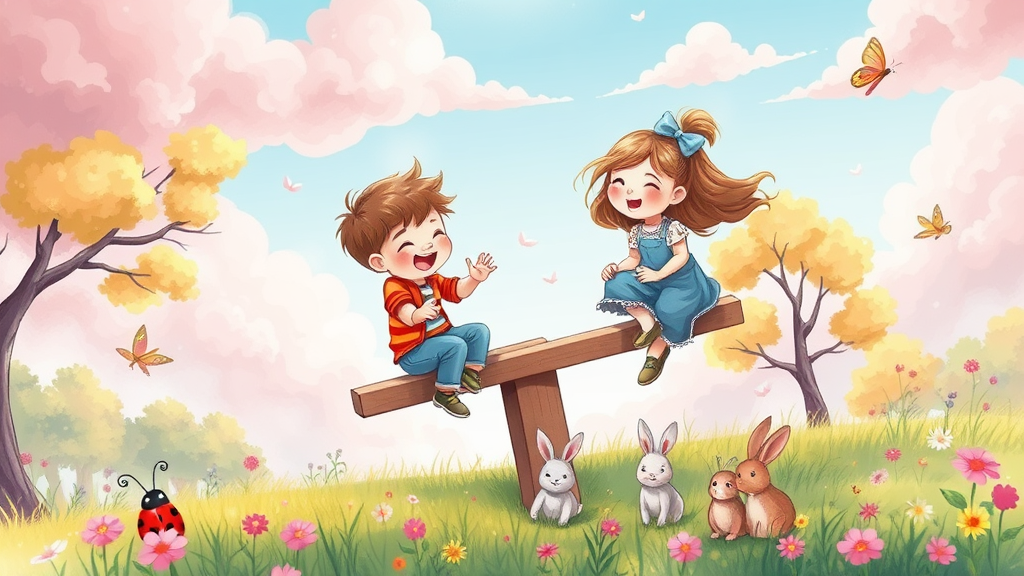A whimsical illustration for a children's book shows a cheerful boy and girl playing on a seesaw, surrounded by a dreamy pastel-colored landscape. Soft hues of pink, blue, and lavender fill the sky, with fluffy clouds shaped like animals. A gentle breeze rustles nearby trees, their leaves tinged with warm yellows and greens. Butterflies and ladybugs dance around the vibrant meadow, where a family of rabbits peeks curiously from behind wildflowers. The children laugh together, a sense of joy and carefree innocence radiating from the scene.