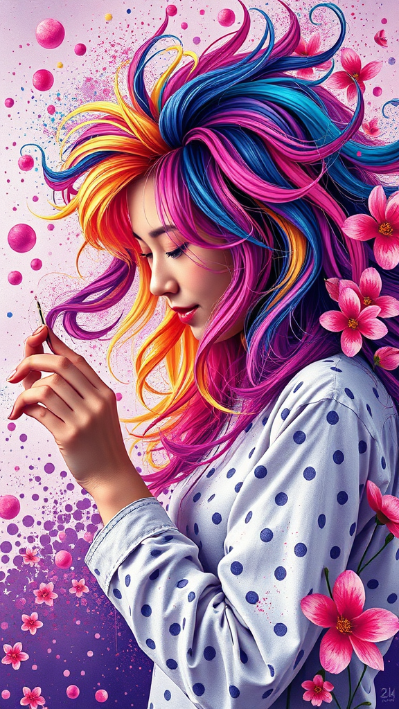 A dynamic artist passionately crafting an abstract work of art, featuring a cascade of colorful hair reminiscent of a lively rainbow, in the style of Kazuo Oga. The scene is adorned with playful polka dots and bursts of blooming flowers. The vivid hues of purple and pink are emphasized, highlighting the artistic expression. Captured in 32K, UHD resolution, the image is rendered in sharp focus, offering an immersive glimpse into the world of creative imagination.