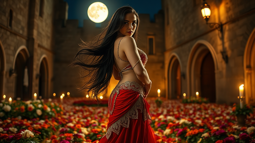 In the courtyard of a medieval castle, a mesmerizing beauty is enveloped by the ethereal glow of a bright full moon, torchlight, and candlelight, which dance upon her exquisite red and gold belly dancer's costume. The delicate interplay of light bathes her in a whimsical luminescence as she strikes a graceful pose. Standing barefoot amidst a vibrant carpet of flowers, her captivating gaze holds the viewer spellbound. A mysterious black band adorns her neck, enhancing her allure. Her wave of raven-black hair flows elegantly down her back as she turns her head slightly, inviting attention with her glance. Photographed with a Leica M10 paired with a Helios-44 58mm f/2 lens at F2.8, the fine art color image brims with deep, luxuriant tones and exquisite highlights. The midday sun enriches her radiant expression, while soft, diffused light threads through her flowing hair, accentuating the sensuous contours of her form.