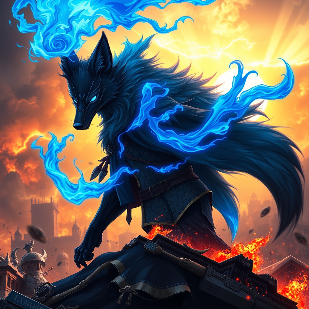 Majestic dark fox wielding mystical azure flames of energy anime style, supreme sorcerer humanoid prince of shadows triumphing on the battlefield, vibrant cerulean inferno and glowing sparks illuminating the surroundings, apocalyptic backdrop, vivid, intricate, sophisticated, digital illustration, breathtakingly detailed, 8k, looming thunderstorm.