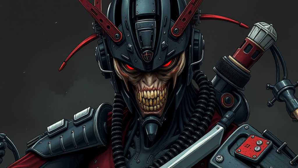 Digital artwork of a brutal cyborg samurai supervillain with a badass anime aesthetic, depicted in the style of a comic. This portrait is rendered in 8k resolution, drawing inspiration from Marvel Comics, set against a dark backdrop with muted colors. The composition is epic and dramatic, capturing an emotionally profound atmosphere with intricate details. The character exhibits a blend of mechanical and organic features, with an unsettling yet captivating presence. The image possesses a raw, gritty quality with imperfections like jpeg artifacts, enhancing its character by embracing distorted elements such as poorly drawn anatomy, exaggerated proportions, and morbid mutations. Features include extra limbs and a duplicated, disfigured face, contributing to the cyborg's menacing aura. The portrayal is further characterized by a long neck and unnatural body shapes, bearing visible flaws and deformities. This complex visual is enhanced by subtle metadata such as the suggestion of camera presence, while the absence of conventional markers like signatures or logos maintains an uncensored, untamed allure.