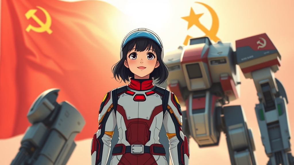 A young girl in a futuristic sci-fi suit stands confidently, embodying the spirit of progress, styled in the vibrant and bold aesthetics of a Soviet-era poster. The iconic hammer and sickle symbol prominently decorates the background, alongside a sleek, towering mech, blending seamlessly into the scene. Bathed in sunny, natural lighting, her expression is joyful and optimistic, reflecting a hopeful future. The design features intricate anime and manga-inspired graphics, incorporating dark, rich colors indicative of offset printing techniques. The poster boasts high detail resolution, captured in 8K, HD, utilizing the CMYK color model to enhance its vividness.