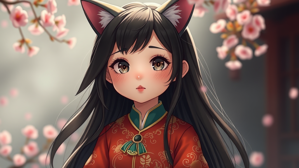 Adorable feline-inspired girl in a beautifully detailed traditional Chinese dress, her whimsical ears poking through silky black hair. The scene is illuminated with dramatic, cinematic lighting, casting soft, enchanting shadows that highlight her enchanting features. Her expressive eyes sparkle with mischief, capturing the ethereal artistry reminiscent of Guweiz and Wlop's styles. Surrounding her are subtle hints of a fantastical setting, with cherry blossoms gently drifting in the background.
