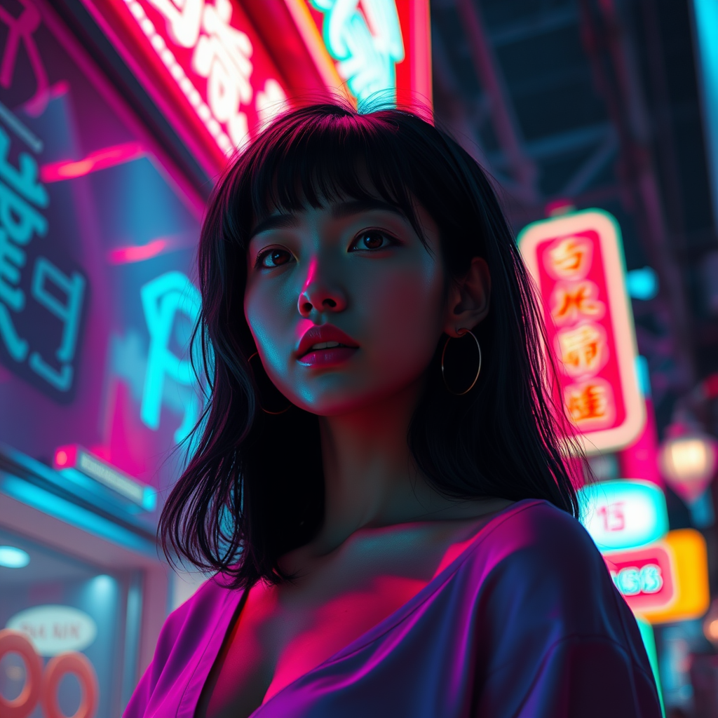 Full length image of a woman illuminated by neon lights against a vibrant backdrop, capturing the essence of vray tracing techniques with stylized portraiture and layered lines. The scene echoes Asian influences, presenting hyper-realistic details with intense close-ups and striking contrasting shadows. The artwork is styled in neon art nouveau with hyper-realistic sci-fi elements, featuring the brightness of pop art with silhouetted figures. Dominated by light cyan and light crimson hues, it reflects the intricate complexity seen in Paul Corfield's work, enriched with complex layers and textures. The image is captured using a Fujifilm X-T4 and a Sony FE 85mm f/1.4 GM lens, emphasizing a raw style with a sense of vivid saturation and dynamic contrasts.