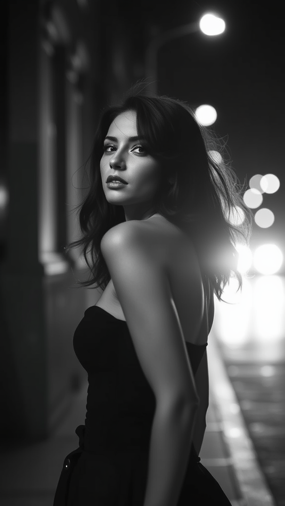 Black and white photography inspired by Bruce Davidson, fashion editorial featuring a dark-haired woman captured through a long exposure photography technique using an artistic lens, high-resolution and realistic photo, professional quality with a cinematic angle, dynamic backlighting, and a beautifully soft bokeh effect.