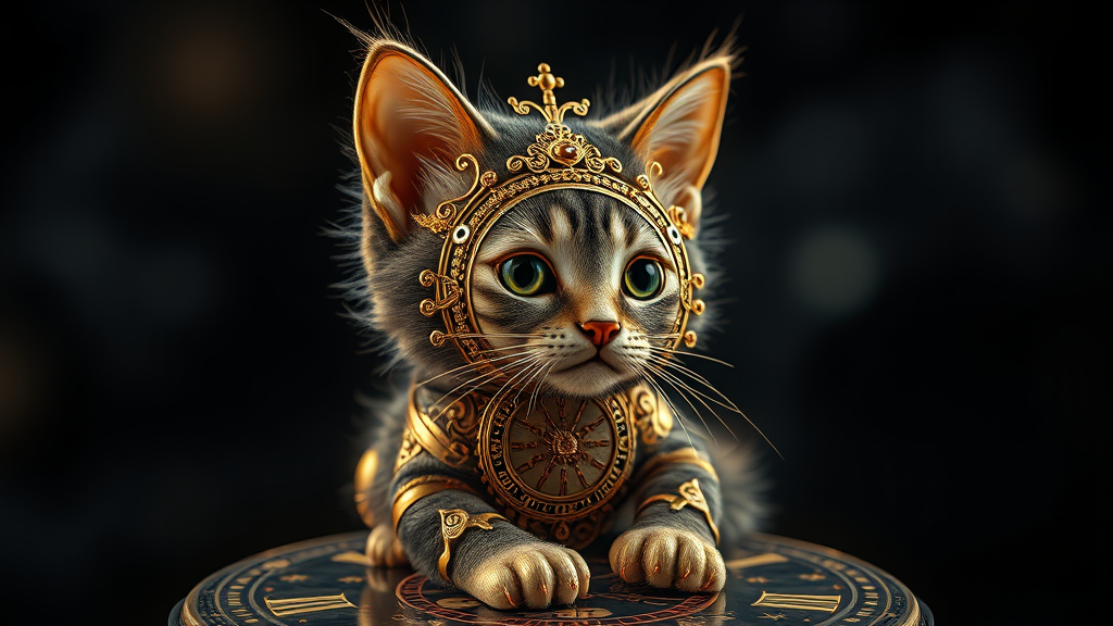 Kitten composed of intricate gold clockwork, adorned with delicate golden filigree set against a moody, abstract dark background, showcasing dramatic chiaroscuro lighting and high detail. The scene captures photorealistic and hyper-realistic qualities with a sense of dynamic motion and acceleration. Presented in cinematic style with long exposure techniques, rendered in exquisite 8K resolution, HD clarity, and super-resolution precision. The aspect ratio remains perfectly square to emphasize symmetry and balance.