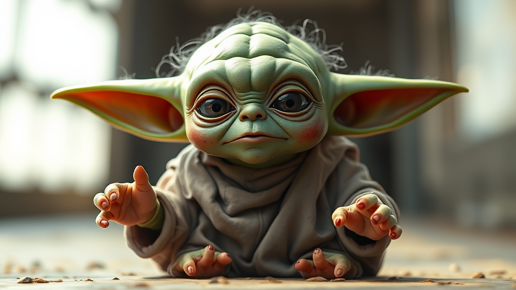 Grogu as Baby Yoda with distorted features, unusual anatomy, and disfigured appearance, featuring abnormalities like extra limbs, irregular face, and unattractive composition. Elements include floating or disconnected limbs, malformed or missing hands, with an overall blurred effect. The scene is overly bright with possible watermarks, a censored aspect, distorted hands, amputation signs, and signs of obesity or dual characteristics in certain features. The appearance is unsettling yet artistically intriguing, maintaining the essence of mutation and imperfection.