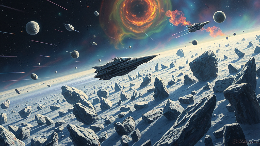 A stunning painting of an alien spacecraft expertly maneuvering through a dense asteroid field, showcasing a small, nimble spaceship deftly avoiding massive asteroids, set against the backdrop of a frigid, desolate void of space. The scene is beautifully detailed with meteorites hurtling past, distant stars twinkling faintly in the background, and colorful gas clouds swirling majestically, all rendered in the enchanting, ethereal style of BelleDeesse.