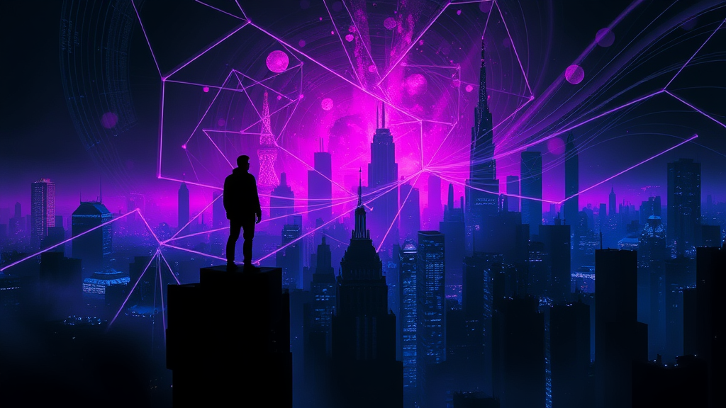 A mesmerizing techno dark album cover design featuring an abstract cityscape drenched in deep shadows and neon lights, with geometric patterns weaving through the skyline. The image exudes a sense of mystery and allure, with moody purple and blue hues contrasting against the stark black architecture, drawing the viewer into a futuristic world. Swirling digital textures overlay the scene, evoking a sense of rhythmic motion and immersive depth. A lone figure stands atop a building, silhouetted against the glowing backdrop, evoking contemplation and intrigue, inviting the viewer to delve deeper into the sonic journey.