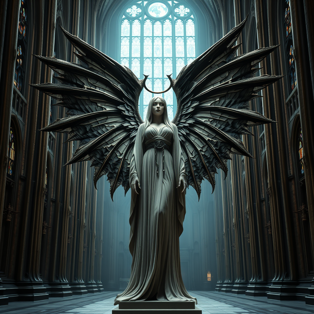 A hyper-realistic sculptural depiction of a demonic female angel named Rucifer stands in the center of a grand gothic cathedral. This intricate and ornate baroque masterpiece showcases her wearing a long, flowing veil dress, with six expansive wings unfurled behind her. A shadowy halo hovers above her head, suggesting her fallen status. The scene is bathed in soft, volumetric light that seeps through the stained glass windows, creating a cinematic atmosphere of both awe and trepidation. The perspective is epic, detailed with ultra-precision, capturing the subtle textures of bone and fabric as if rendered in ZBrush with the highest fidelity. The ambient lighting complements the composition, emphasizing the rule of thirds in a photorealistic manner, as if rendered with Unreal Engine 5 in 8k. The earth looms in the background, partially illuminated, casting an otherworldly glow over the sculpture that blends Guillermo del Toro's imaginative style with a dark, epic realism.