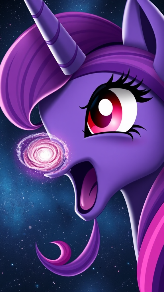Colossal Twilight Sparkle from My Little Pony, vast and majestic, larger than the universe, drifts through the cosmos. A tiny, swirling galaxy hovers near her lips, sparkling like a jewel. Up-close perspective, intense focus on her open mouth as she consumes the galaxy, with eyes ablaze in a vibrant, ethereal crimson. Hyper-realistic and fantastical rendering, capturing an awe-inspiring blend of power and surreal beauty.