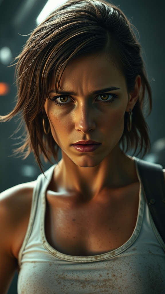 Epic cinematic 8k wallpaper featuring Ellen Ripley from the Alien movie, embodying determination with her resolute and serious expression. She is clad in a white worn and gritty tank top. The atmosphere is charged with action; capturing a half-body shot at a wide angle. Sweat beads on her forehead and cheeks are highlighted in this close-up. The image is photorealistic, boasting cinematic quality with advanced VFX post-production techniques. The lighting is enhanced with RTX ray tracing, delivering ultra-realistic and hyper-detailed visual fidelity. Shot in 4k, upgraded to 8k using a Mitchell BNC camera, with Octane render to ensure an immersive high-definition HDR experience.
