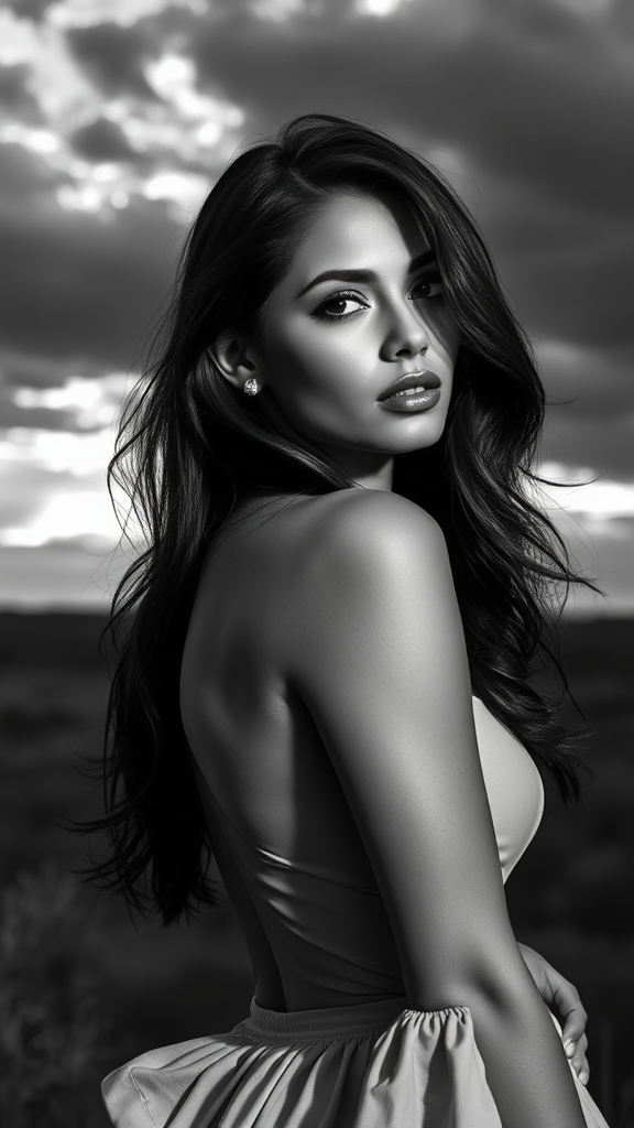 Elegant black and white photograph capturing a striking portrait of a stunning dark-haired woman poised gracefully in a natural landscape. The scene is set against a moody, dramatic sky, with captivating interplay of light and shadow highlighting her features. Shot in high resolution by a professional photographer, the image exudes a cinematic angle with dynamic light casting a gentle glow from behind, adding depth and an ethereal quality to the composition.