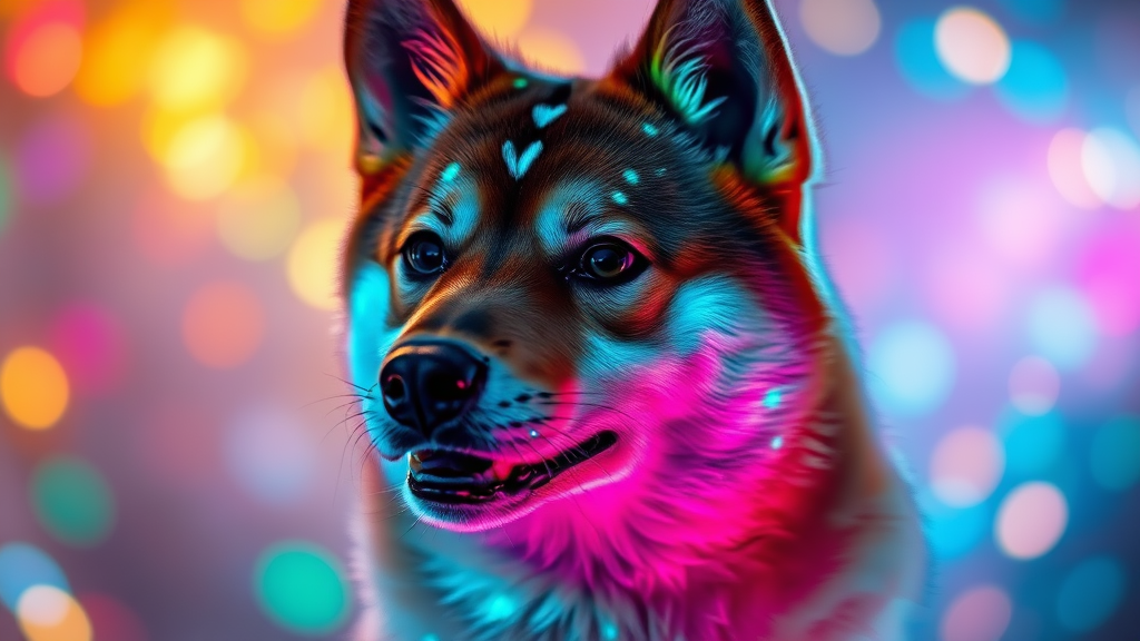 A captivating portrait of a shiba inu dog with glowing, bioluminescent fur, set against a backdrop of vibrant colors and shimmering light. The soft illumination highlights the dog's playful expression, creating an ethereal and enchanting atmosphere. The artwork, with its exquisite detail and 8k resolution, mirrors the style of Carne Griffiths and evokes a sense of magical realism, making it a trending masterpiece on art platforms.