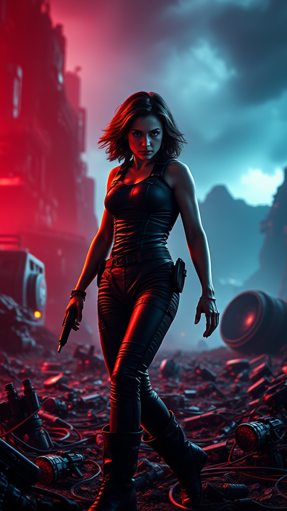 Epic cinematic high-resolution wallpaper features Ellen Ripley, showcasing her iconic and determined stance amidst a sci-fi landscape, accented with futuristic technology and atmospheric lighting; rendered with stunning detail to capture the intensity and bravery of her character in a polished, ultra-realistic 8K quality.
