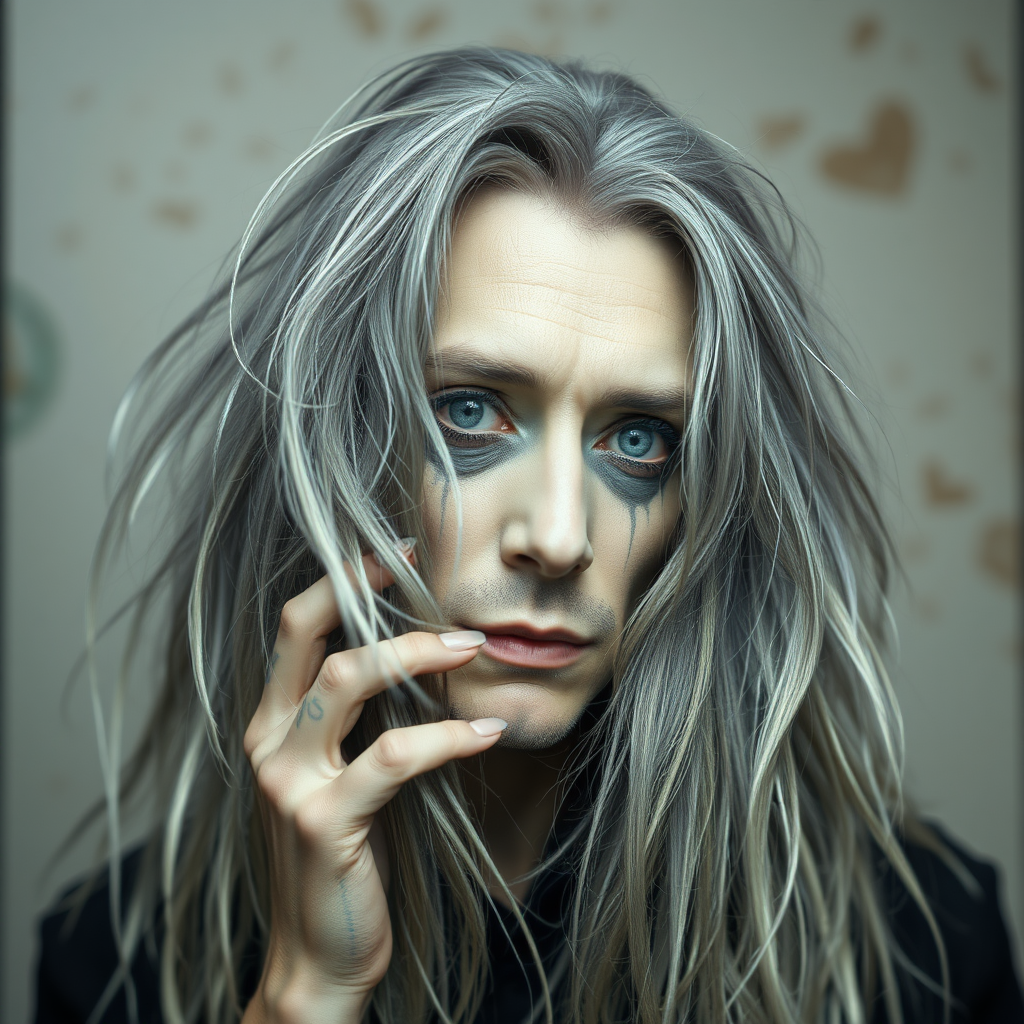 A solitary man with long, flowing grey and white hair, portrayed in a somewhat blurry and abstract style; the rendering exhibits elements of unconventional art with quirky anatomy and noticeable imperfections, akin to a 3D render with low resolution; the subject's face is adorned with exaggerated makeup, and there are peculiar features like oddly proportioned hands and obscure text elements subtly integrated into the scene.