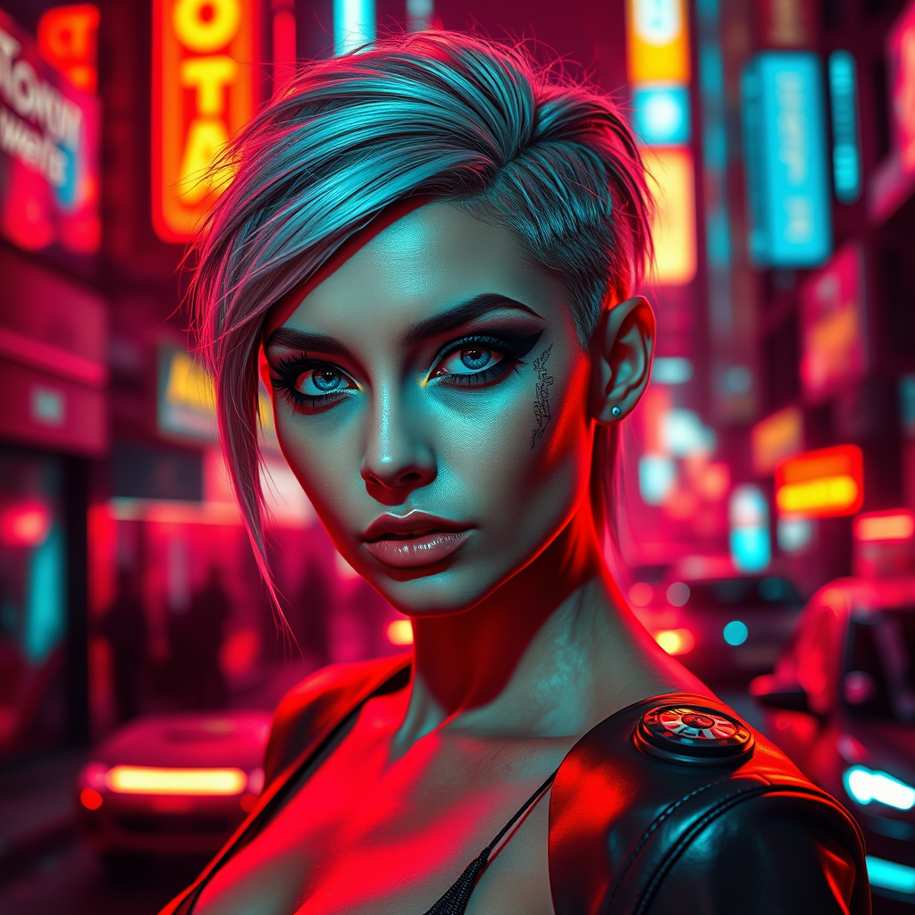 A stunning pale cyberpunk woman with striking blue eyes and heavy black eyeliner, her hair styled with a shaved side and intricate detailing under hyper-cinematic lighting. She stands amidst a city awash in dark red hues, illuminated by vibrant, magical neon glows reflecting off sleek surfaces. Her expression is enigmatic, evoking an air of mystery and allure, as if she seamlessly blends into the futuristic, neon-bathed urban landscape.