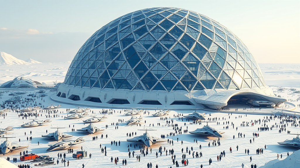 A bustling spaceport sprawls across the snowy landscape, where numerous sleek spaceships rest on vast landing pads. Crowds of people, dressed in futuristic attire, meander through the busy area, their breaths visible in the crisp air. Dominating the scene is a colossal dome-shaped structure, a marvel of innovation crafted from intricate layers of white and grey stone interwoven with gleaming glass panels. The structure stands as a beacon of modern design amid the wintery setting, its surfaces reflecting the soft light of a pale winter sun.