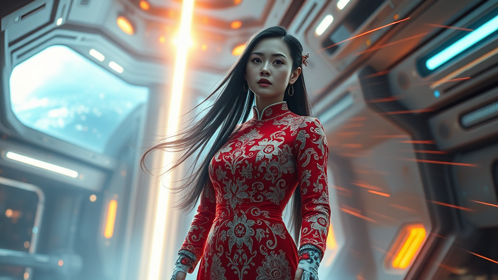 A cybernized girl with advanced cyberpunk prosthetics, clad in an intricate Chinese dress, her long hair flowing elegantly. She stands in the futuristic interior of a spaceship, surrounded by an atmosphere of sci-fi wonder. The setting is hyper-detailed, with a powerful laser at the center, piercing through the space like a beam from the heavens. Energy pulses around, creating vibrant clots of power that illuminate the scene. The image is captured in photorealistic detail, reflecting hyper realism with a sense of acceleration and dynamic movement. Light flashes and speed trails add to the cinematic impact, evoking a painting brought to life in 8K and HD super-resolution. The scene is depicted with a long exposure, enhancing the sense of motion and merging the surreal with the real, all while maintaining a sense of awe-inspiring spectacle.