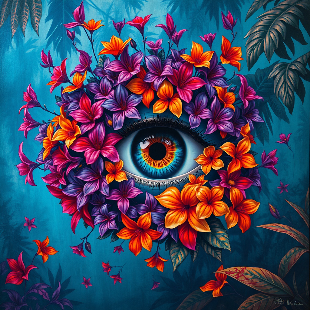A mesmerizing painting of an eye enveloped by an array of vibrant purple and orange flowers, set against a mysterious jungle backdrop. The style is reminiscent of James Jean and Martin Ansin, infused with elements of Papua New Guinea art. Hues of light blue and red contrast beautifully, creating a vivid, poster-like quality. The artwork captures an ethereal, enigmatic atmosphere with intricate details, showcasing a harmonious blend of nature and surrealism.