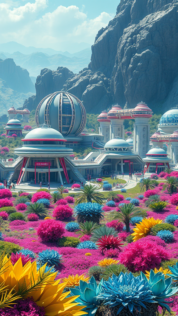 A sprawling human colony on an enigmatic planet, boasting retro-futuristic architecture with sleek, metallic curves and neon accents. Surrounding the colony, the landscape is a vivid patchwork of bright, vibrant vegetation, with exotic plant life in shades of electric blue and vivid magenta, creating a mesmerizing contrast against the settlement. The scene is rendered in hyperrealism, showcasing intricate details and lush textures in both the architecture and the alien flora, with every surface and structure meticulously detailed, capturing the essence of a harmonious coexistence between human ingenuity and the planet's otherworldly beauty.