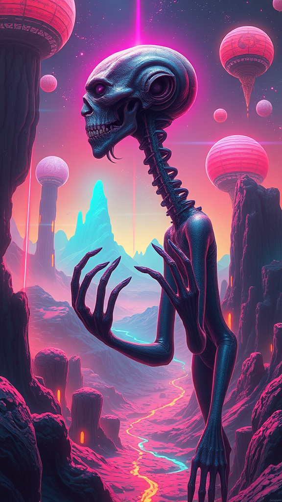 A digital painting inspired by the fusion of styles from Ernst Haeckel, Maria Sibylla Merian, Tristan Eaton, Victo Ngai, Artgerm, Rhads, Ross Draws, Kaethe Butcher, Hajime Sorayama, Greg Tocchini, Virgil Finlay, and Ilya Kuvshinov. It captures a sci-fi world bathed in vivid colors and neon lights, rendered in stunning 8k UHD and HDR quality. The scene features a surreal humanoid figure with an elongated neck and multiple fingers, evoking both fascination and intrigue. This figure is set against a backdrop of futuristic architecture and glowing landscapes, all meticulously crafted to enhance the sense of wonder. Elements of mutation and transformation are artistically depicted, as if the character is evolving or adapting to this otherworldly environment. The image maintains its sharpness and clarity, avoiding any blurred edges or distracting artifacts, allowing viewers to immerse fully in the imaginative universe presented.