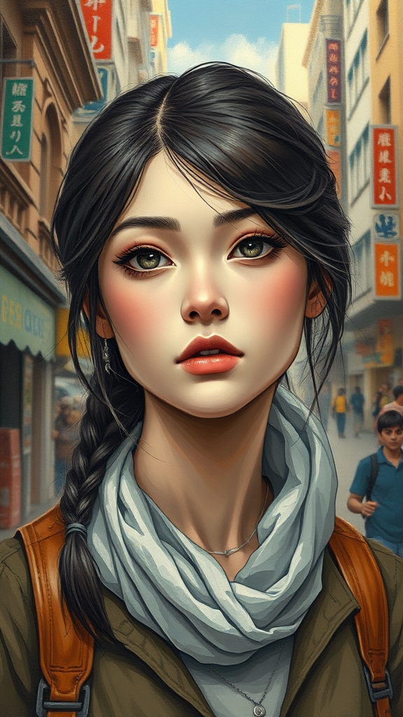 Exquisite artwork, exceptional quality, portrait of a young woman, alone, incredibly detailed facial features, urban setting, bustling street.