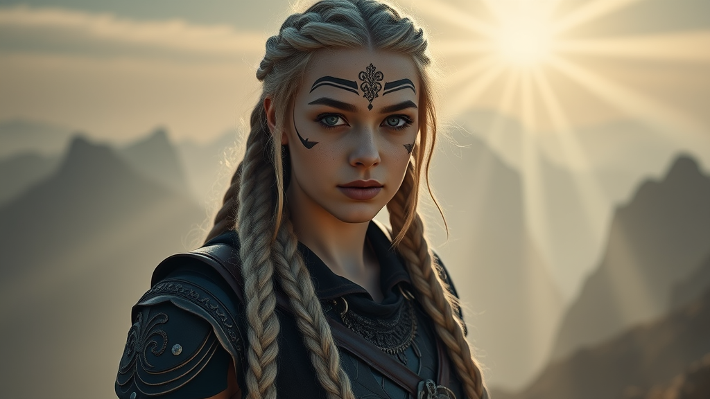 A beautiful 25-year-old war princess stands gracefully in a full body image capturing the essence of a 1980s cinematic film still, evoking the aesthetics of a 1950's camera with a 35mm film grain and Kodak Portra 800 quality. Her long, braided blonde hair flows elegantly, framing her symmetrical face adorned with cultural face paint. She gazes captivatingly with bright grey eyes, her expression both alluring and enigmatic. Her attire, a finely detailed cloth armor, reflects intricate and elegant design. The backdrop features a mesmerizing view of foggy mountain peaks, harmoniously symmetrical, with radiant light rays piercing through the mist. The setting, an urban fantasy realm, is bathed in magical lighting, highlighting the dust particles in the beams. High-resolution details capture her stunning facial features, realistic skin texture, and meticulously crafted clothing. The scene boasts realistic shadows and ambient occlusion, creating a photorealistic portrayal with a touch of moonlit magic. The image carries a light aesthetic, with a blend of moody, heavenly, and shadowy elements, ensuring an ultra-realistic, visually compelling depiction that feels alive and vibrant.
