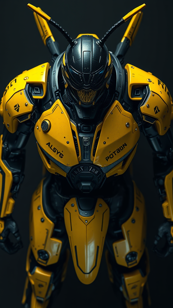 A sleek black and yellow battle mech with intricate sci-fi details and a stunningly designed mask, featuring reflective yellow body armor and a powerful jetpack. This insectoid-inspired combat mech exudes a sense of eerie intimidation with its bright yellow polymer armor adorned with unique identifying marks. Its inner mechanisms and natural textures add layers of realism, enhanced by natural reflections. Set against a dark, dramatic background, the top-down view showcases the mech's stunning quality. Captured with ultra high resolution and cinematic Rembrandt lighting, the scene is hyper-realistic and in 8k UHD. The emphasis remains on sharp detail and vivid contrast, bathed in artistic shadows to highlight its formidable sci-fi presence.