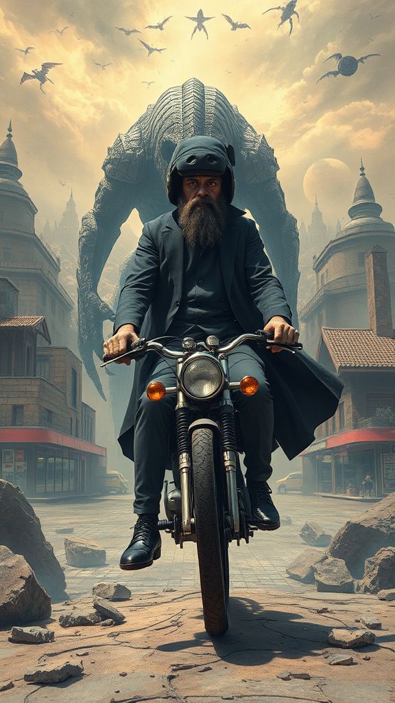 A mysterious figure stands alone in an otherworldly, occult-inspired scene. This full body portrait features the figure in a dignified ojou-sama pose amidst a city besieged by colossal monsters. The setting unveils a virtual reality world that has taken a disconcerting turn toward reality, with shining fragments of ancient ruins scattered around. A fusion of styles is evident: elements from a 1920s aesthetic with two faces, two individuals merged into a single concept, resemble a vivid motorbike journey through surreal environments. A nod to Vincent Joyal's artistic sense is sensed in the supermarket-turned-fantasy realm to a classic farmhouse interior and sprawling cityscape. The composition showcases a unique fashion sense: intricate shoe laces, pointed footwear, and an exaggerated head wearing a long beard. Muted colors evoke textures of iron, while the figure, perched on a bike, confronts a world on the brink of chaos. Distinctive characteristics such as two navels and unconventional features blend seamlessly into this alternate reality, evoking both fascination and bewilderment. Despite the unusual modifications, the core remains an evocative portrayal of a world where virtual meets reality, maintaining its conceptual integrity.