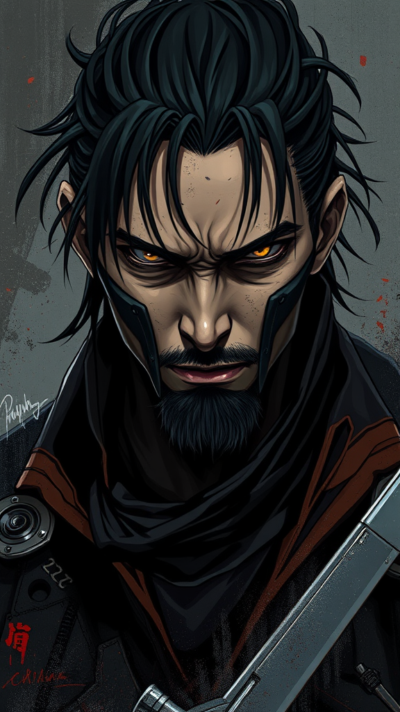 digital wallpaper portrait of brutal cyberpunk ronin, anime, inspired by marvel comics style, dark, muted palette, intense epic composition, dramatic, digital illustration, highly detailed, with intentional imperfections, jpeg artifacts, rough quality, unconventional beauty, duplicated elements, eerie, altered, dehydrated look, irregular anatomy, unbalanced proportions, extra limbs, duplicated facial features, distorted, exaggerated proportions, contorted limbs, missing or additional limbs, elongated neck, with camera effects. Interspersed with random elements like signatures, watermarks, logos. Cropped and obscured features to emphasize flawed anatomy, irregular body structure, and unique facial expressions.