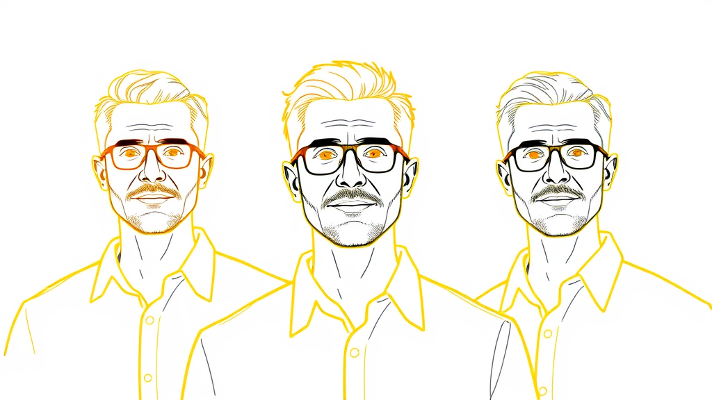 Three men sketched in bold yellow outlines, each standing tall and distinct against a minimalist backdrop, the vertical composition highlighting their unique features and expressions.
