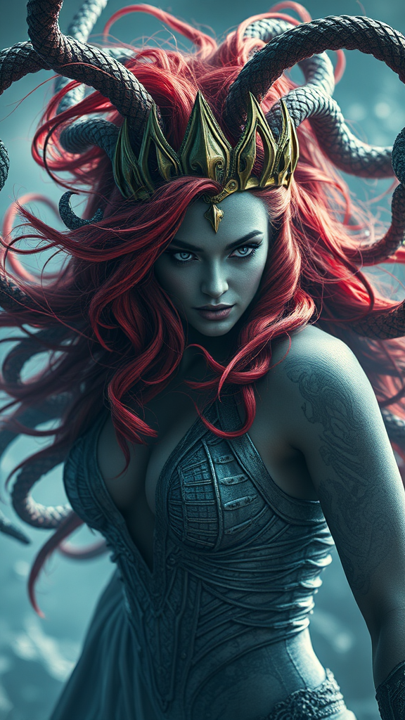 Create a transformative piece of extreme vivid fantasy realism art, capturing an ultra-detailed masterpiece of Medusa from Marvel Inc. in hyper-realistic fantasy digital photography. The image is meticulously captured with precision and care, perfectly centered for composition. Utilize overexposed photography to craft a striking and ethereal atmosphere, while maintaining sharp focus to ensure exquisite detail. The depiction features clear, bright elements that highlight her iconic red hair and expressive eyes, filled with a captivating blend of regal command and inner turmoil. Emphasize the intricate details of her flowing, vibrant hair and stoic pose, seamlessly blending realism with fantasy. Celebrate the essence of her power through the visual narrative, capturing her inner conflicts in a visually stunning and imaginative setting, and make subtle creative modifications that enhance the core concept while preserving its originality.