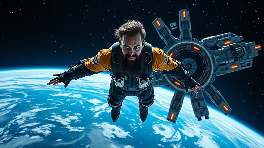 A photorealistic image of a man in a weightless state, approaching a space station, with intricate details and an 8k resolution. The scene is set against the backdrop of a dark blue sky filled with stars, with Earth visible in the background. The composition is striking, showcasing an impressive spaceship design. The man is portrayed with two distinct faces, reminiscent of Matthias Schoenaerts. He is dressed as a biker, complete with a motorbike, long beard, and pointed footwear. The concept is imaginative, blending an Ironman aesthetic with sci-fi elements, while incorporating quirky details like two navels and fused fingers. The image is rich in color with a vivid depiction of space, ensuring visual intrigue and stellar artistry.