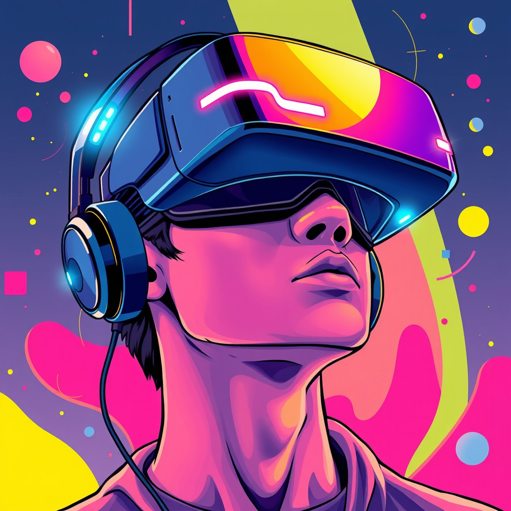 A detailed illustration of an individual wearing a cutting-edge virtual reality headset and sleek headphones, inspired by Victor Mosquera's neo-dada style, featuring elements of vaporwave aesthetic and cartoonish hyperrealism. The image showcases vibrant colors and fluid vector art lines, capturing the essence of a digitally immersive experience with a futuristic twist. The person appears deeply engaged with their virtual environment, their face illuminated by the glow of the VR display, and surrounded by abstract shapes that hint at a dynamic digital world.