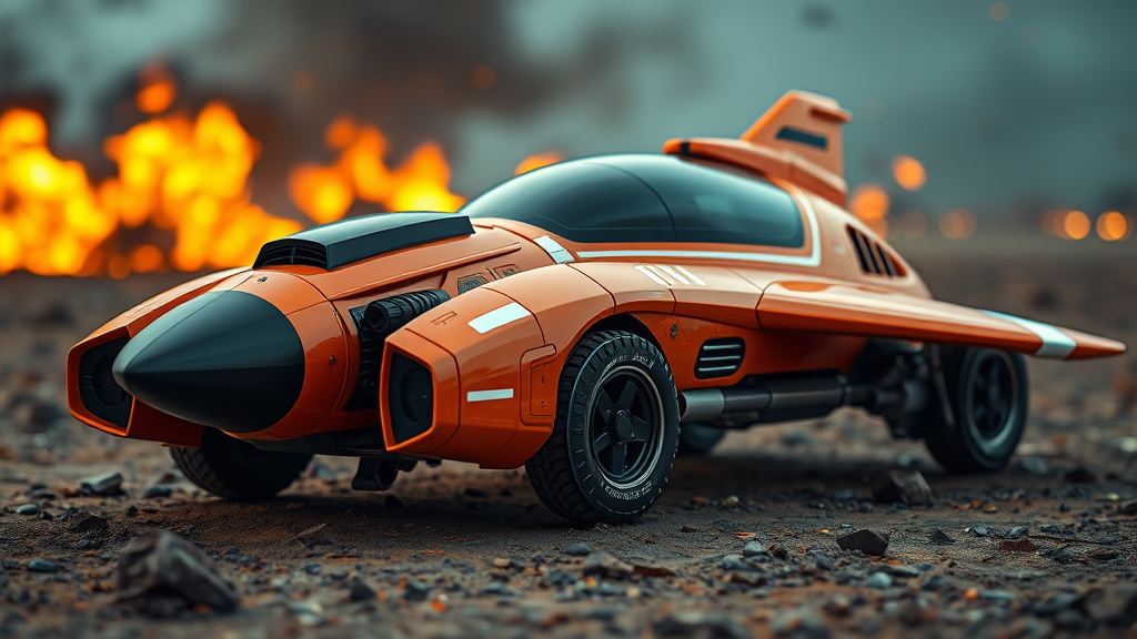 Futuristic concept spacecraft blending features of a military jet, showcasing a sleek metallic orange exterior with matte black and white accents, embodying luxury and high detail. Rendered in 8k sharp focus, the wide photo shot captures an ultra-photorealistic design influenced by sci-fi aesthetics. The craft, with its blurred and dreamlike contours, rests on the ground, equipped with wheels reminiscent of an airplane. Amidst a fiery battlefield or warzone, it exudes a sense of untamed dynamism yet evokes the playful essence of tangible models like dolls, toys, or even Lego. Despite the chaotic scene, the overall composition gives an impression of a toy-like, larger-than-life object crafted by an imaginative artist.
