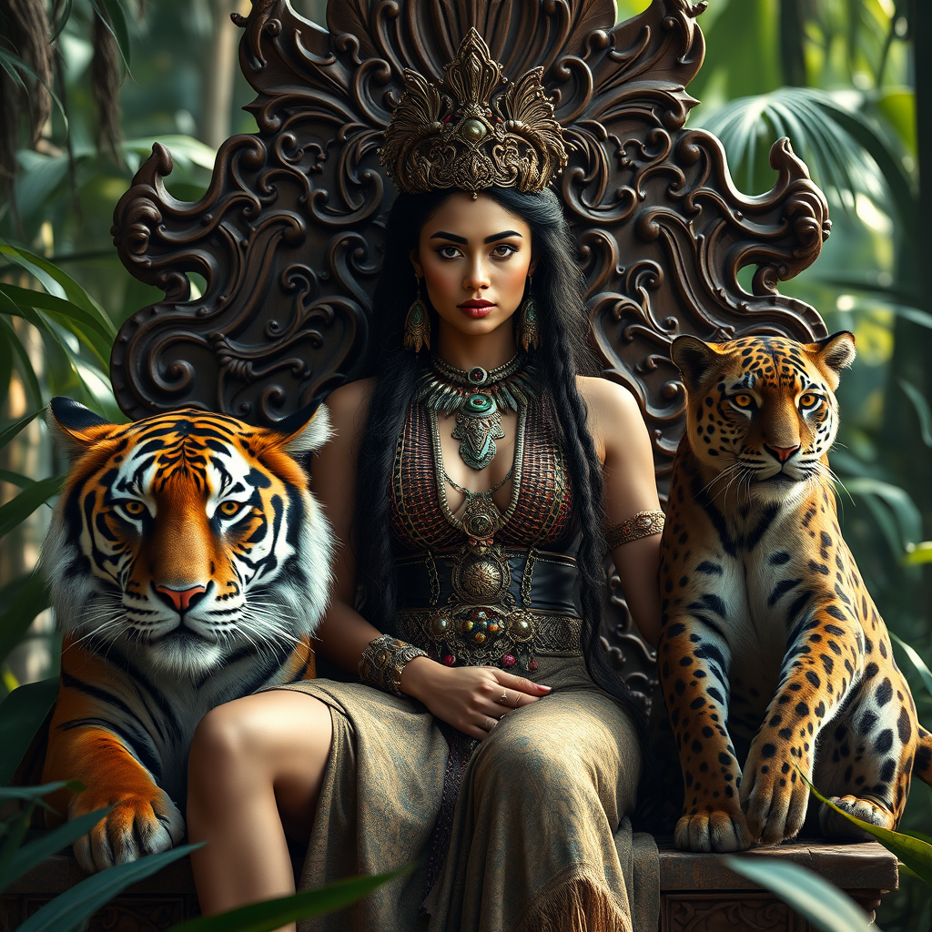 A stunning π goddess seated on an intricately carved jungle throne, flanked by a majestic tiger and a sleek panther, exuding an aura of power and grace. Her face, detailed and captivating, reveals wisdom and serenity, photographed in a lush, vibrant jungle setting. Cinematic lighting bathes the scene in ethereal tones, capturing the essence of junglecore style. This character portrait exudes the signature style of Annie Leibovitz, with subtle enhancements that reflect the expert retouching of Pratik Naik, creating a mesmerizing and timeless visual narrative.