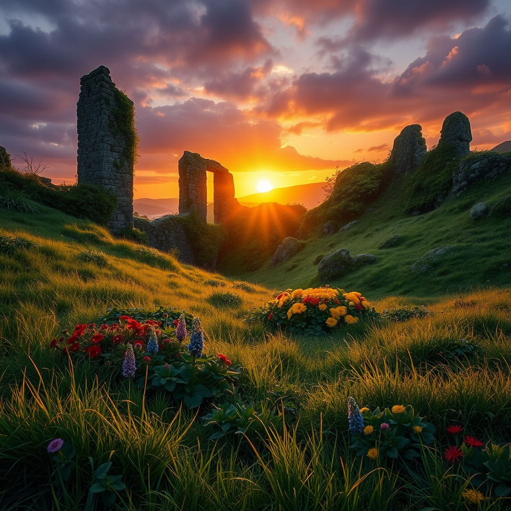 A twilight scene featuring an enchanting, ancient Celtic kingdom overtaken by wild nature, where the final rays of a dark sunset cast a golden hue over lush, green meadows and vibrant, colorful flowers. Towering stone structures, partially hidden by creeping vines and moss, peek through the dense flora and the soft, rolling hills of this mystical realm. A gentle breeze rustles through the grass as the sky transitions into shades of deep purple and indigo.