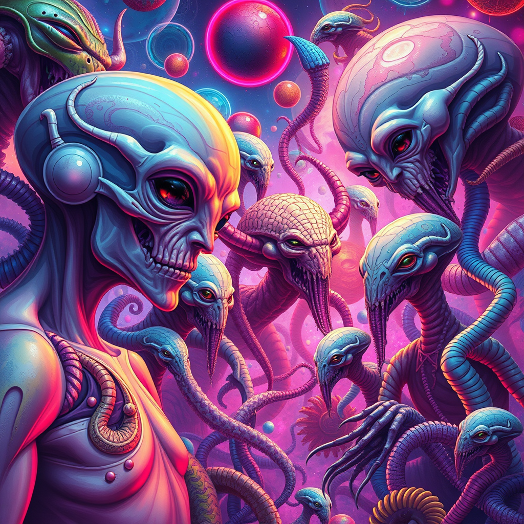 Incorporate elements from renowned artists like Ernst Haeckel, Maria Sibylla Merian, Tristan Eaton, Victo Ngai, Artgerm, Rhads, Ross Draws, Kaethe Butcher, Hajime Sorayama, Greg Tocchini, and Virgil Finlay, blending their unique styles into a sci-fi digital painting. Emphasize vibrant colors, neon lights, and a futuristic aesthetic reminiscent of Ilya Kuvshinov's works. Capture a high-definition, 8k resolution image that portrays a fantastical world where human and alien life forms coexist, with mutations suggesting extra limbs and features, yet blending seamlessly into the harmonious chaos. Eliminate low-resolution, out-of-frame, and blurry elements, while avoiding artifacts like watermarks or logos. Inhabit the scene with creatures displaying subtly distorted features such as cross-eyed expressions or elongated necks, artistically capturing the essence of mutation and evolution in an otherworldly context. Explore vibrant, surreal environments filled with imaginative landscapes and characters, maintaining a balance between artistic mutation and visual appeal.