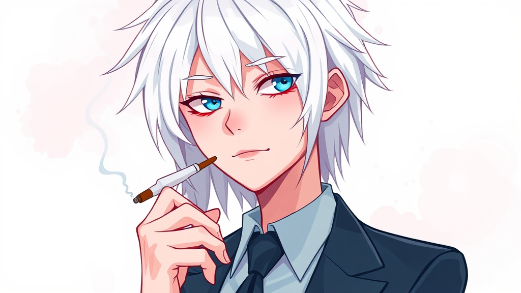 Create an illustration of a character with striking white hair and sharp, gentle eyes, exuding a calm confidence. The character is depicted in a stylish suit, holding a cigarette between their fingers. The design is inspired by the digital artistry of Yanjun Cheng, combined with elements from Beeple, Rhads, and Lois van Baarle. The artwork has a cartoon-like style with bright pastel colors, giving it a retro anime feel. The character appears serene and enigmatic, standing against a soft, abstract background that enhances the overall vibrant and dreamy aesthetic.