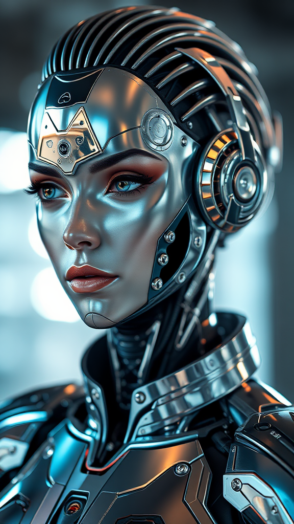 futuristic sci-fi portrait of a cybernetic guardian female android, shimmering chrome skin, intricate robotic features, polished mechanical armor, metallic plating with reflective surfaces, sleek metal hair design, captured with 85mm lens, f/2 aperture, soft bokeh, pronounced depth of field.