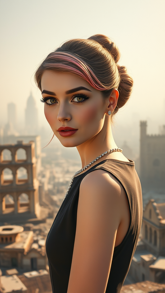 RAW photo, inspired by Audrey Hepburn, set against a backdrop of city ruins, displaying an 8k uhd quality image with the ambiance of a dslr capture. The scene is bathed in soft lighting, enhancing the high quality with subtle film grain effects reminiscent of a Fujifilm XT3 illustration. A blend of techniques and styles, the image marries elements of 3D rendering with a sepia-tinted painting aesthetic, cartoon influences, and sketch-like details. Introducing creative elements such as slightly surreal features, the composition includes contrasting extras like a hint of pink hair against an analog photo backdrop, along with deliberate imperfections in anatomy and facial features to evoke an artistic, slightly abstract representation.