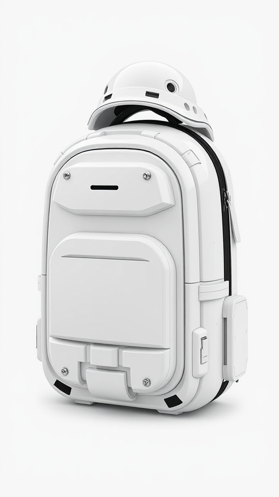 Futuristic hardcase capsule-shaped white backpack inspired by urban stormtrooper aesthetics, featuring sleek and minimalist product design with intricate and detailed textures, rendered in 4K with a clean white background, influenced by the design philosophies of Dieter Rams and Apple, with subtle creative enhancements for a modern touch.