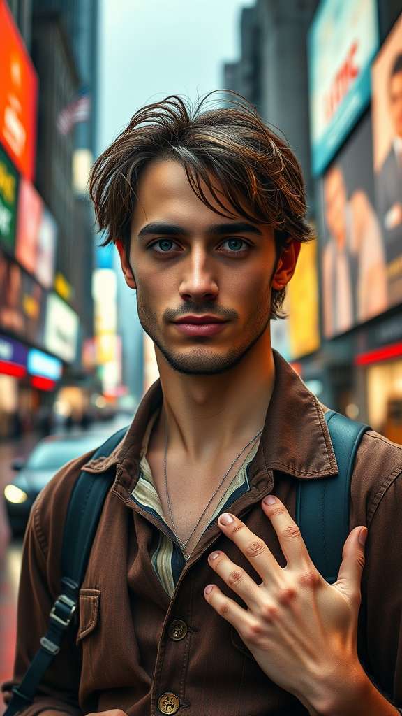 A strikingly handsome Mediterranean man stands confidently in a rainy Times Square. His medium-length hair is slightly tousled, complementing his perfect, symmetrical face. His bright eyes catch the light, lending a spark to his expression. He's dressed in a retro outfit that seems unusual and oddly designed, creating a contrast against the vibrant city lights. The scene is surreal with warped proportions; additional limbs and features seem oddly misplaced. His face, though intended to be flawless, appears oddly reconstructed with unexpected details. Extra fingers and elongated limbs twist in unnatural directions. The overall composition depicts a blend of ideal beauty and strange distortions, with a hint of the fantastical amidst the bustling city backdrop.