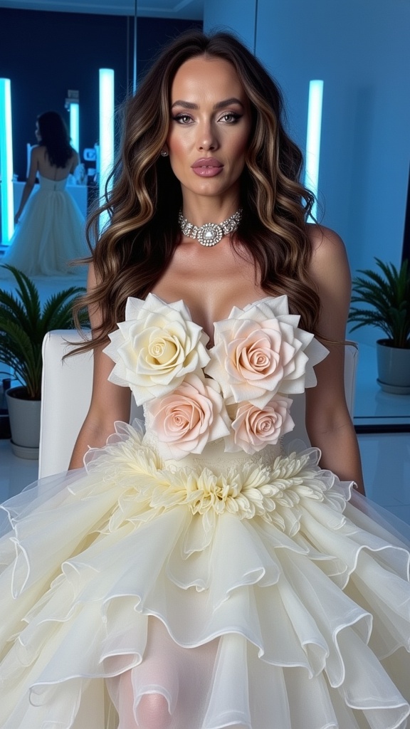 “Angela is a glamorous woman wearing an ethereal, haute couture dress with an intricate floral design. The gown features a sheer, structured corset bodice that accentuates her figure, adding a modern and elegant touch. The upper part is adorned with voluminous, handcrafted fabric roses in soft ivory and blush tones, creating a delicate and romantic aesthetic. The floral embellishments continue down to the skirt, where layers of ruffled, petal-like textures form a luxurious and sculptural silhouette. The fabric is airy and lightweight, resembling chiffon or organza, giving the dress a dreamy, floating effect. Angela’s hair is styled in an elegant long brown wavy hair, and she wears a statement diamond choker that enhances the regal sophistication of her look. The background features a dimly lit, futuristic setting with neon blue reflections, contrasting with the softness of her outfit and adding a high-fashion editorial vibe.”