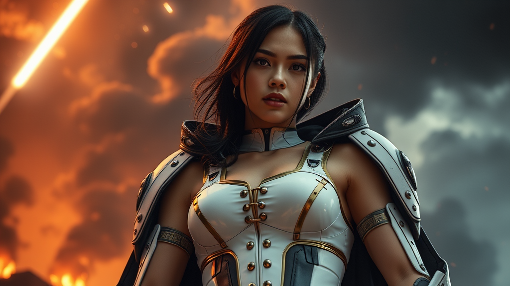 A captivating three-quarter close-up portrait of a stunningly beautiful young woman with a slender athletic build and an aristocratic face displays both an arrogant and innocent expression. Her striking appearance is complemented by her sci-fi battle armor mech inspired by Ghost In The Shell, featuring a sleek white jumpsuit with armored leggings and a dense cloak. The scene is set amidst a meteor shower, billowing black smoke from distant fires, and ominous thunderclouds, creating a dramatic and oppressive backdrop. The reflections of fires illuminate the atmosphere, enhancing a sense of gloom and chaos. The composition is captured from a low-angle frame using a Canon EOS 5D Mark IV DSLR at f/8 aperture, 1/250 second shutter speed, and ISO 100. The image showcases superb detail and hyper-realism, enriched by natural textures and cinematic lighting. Bright and blinding lights accentuate elements like a gold corset adorned with rivets, while her bare arms, neck, and chest convey vulnerability amidst the turmoil. The artistic portrayal balances a striking visual narrative with creative alterations, ensuring the portrayal remains captivating and free from errors like deformations and distortions.