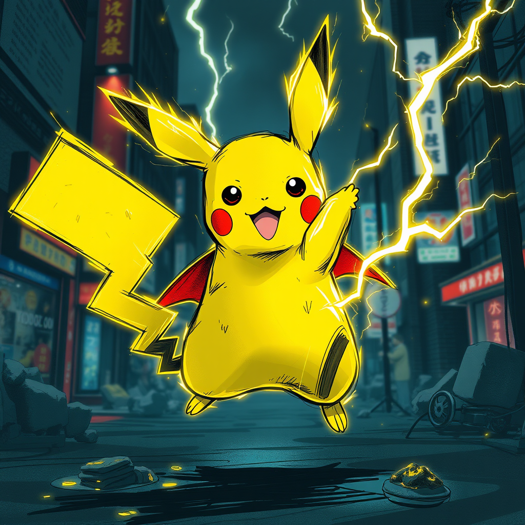 Pokemon Pikachu in an energetic pose, rendered in an anime-inspired sketch with abstract brush strokes and bold, heavy lines. The scene captures an HDR Neo-Noir aesthetic, featuring Pikachu with a bright yellow neon glow, accented by a fiery devilish cape. The proportions are perfect, echoing a blend of beauty and mischief from the underworld. The environment is influenced by Cyberpunk Edgerunner style, set in a late-night backdrop with elements of breath of fire and cold chaos. The artwork boasts strong contrast, viewed from a distance in stunning 8K image quality, evoking a flickering, tender impression in the style of Loish and Jeremy Mann. It is a full-body shot character sheet, showcasing a lightning wave effect, with 3D and CG graphics bringing the glowing neon elements to life. Despite the chaotic setting, there is a sense of delicate balance and harmony throughout the piece.