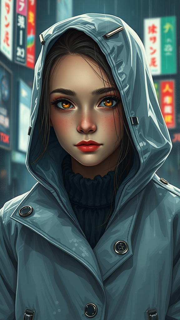 A portrait of a European young girl wearing a storm rain movie jacket coat, showcasing futuristic sci-fi fashion and royal attire. Inspired by the styles of Ismail Inceoglu, Dragan Bibin, Hans Thoma, Greg Rutkowski, Alexandros Pyromallis, Nekro, and Rene Magritte. The illustration features a perfect face with sharp features, realistic shading, and fine details. The pretty face is set against a backdrop of cyberpunk, neo-Tokyo, and synth-wave aesthetics, with influences from Bladerunner movie scenes. The artwork is a digital painting capturing a blend of CGI, 3D, and anime elements, all while maintaining a clear focus on high-quality digital art. Despite the detailed visuals, the scene steers clear of common pitfalls like poorly drawn hands or faces, ensuring all anatomical features are proportional and precise. The portrait avoids low resolution, text, and other artifacts, presenting a polished and immersive image that is free from deformities or unrealistic proportions.